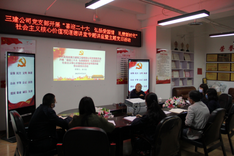 (省三建公司 訊 韓毓、王文杰/文 韓毓/攝 )2022年是黨的二十大召開之年,是落實(shí)省第十四次黨代會(huì)精神開局之年。為持續(xù)鞏固拓展黨史學(xué)習(xí)教育成果,加強(qiáng)精神文明建設(shè),深化民族團(tuán)結(jié)進(jìn)步宣傳教育和感恩教育,講好各族民族守望相助、團(tuán)結(jié)奮進(jìn)的國企故事,積極培育和踐行社會(huì)主義核心價(jià)值觀,9月21日,公司黨支部開展“喜迎二十大 弘揚(yáng)愛國情 禮贊新時(shí)代”社會(huì)主義核心價(jià)值觀道德講堂專題講座暨主題黨日活動(dòng)。
